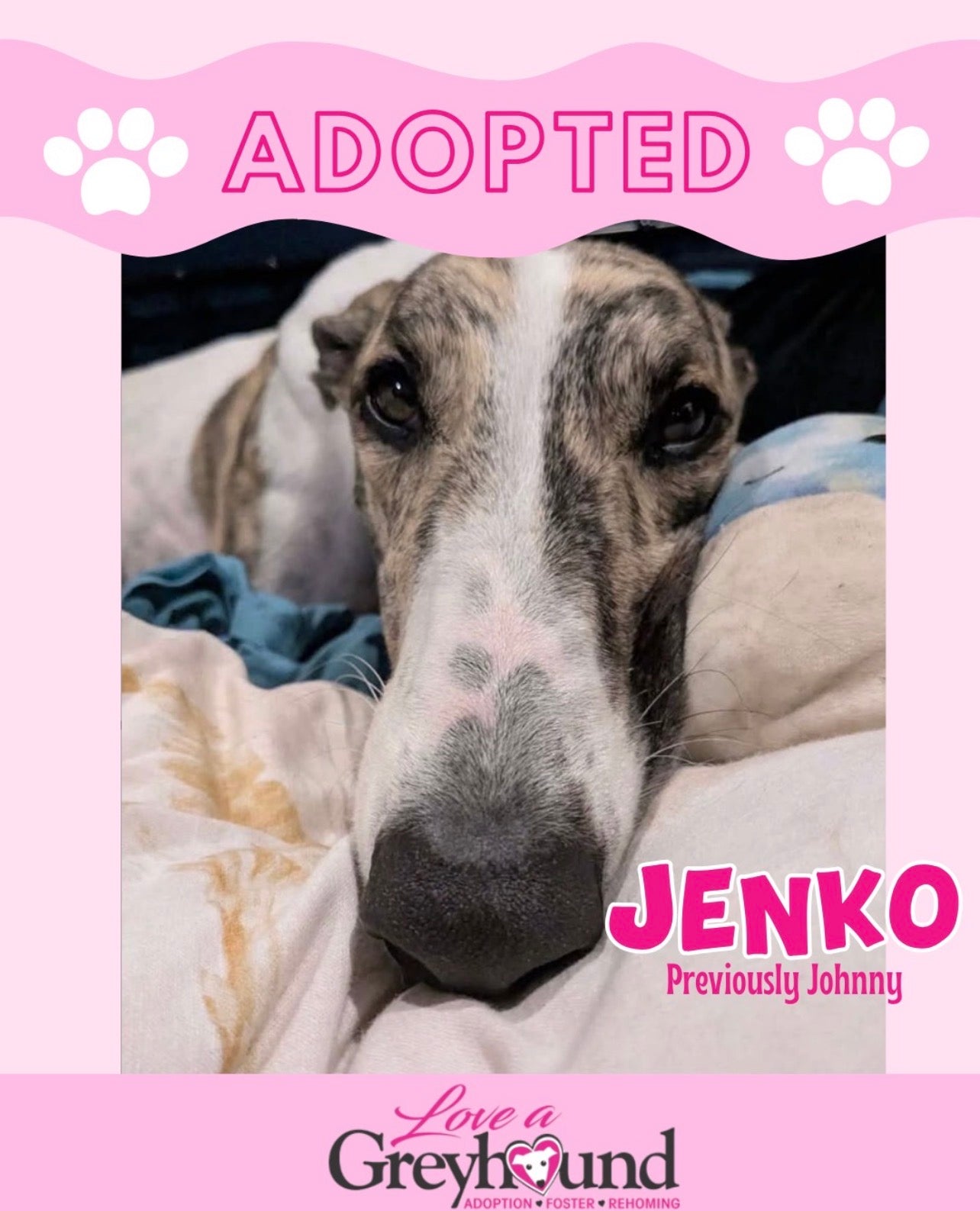 From the moment we met Gizmo, we fell in love with him and knew he would be perfect for our family. There was no question we wanted to adopt him!Gizmo is so friendly and loves meeting new people and doggie friends. We take him for walks with local greyhound groups and many sniffaris, he loves rides in the car and splashing around in the bay. Gizmo immediately made himself at home and was roaching at the end of the first day with us. He’s settled in well relaxing close to us on his bed surrounded by his toys. He’s an affectionate boy who loves a snuggle. The best part of the day is his morning wake up calls - with a snoot in the face.Thank you to all the work LAG do and also to Aaron and Amanda for fostering him and giving him such a great start to family life.