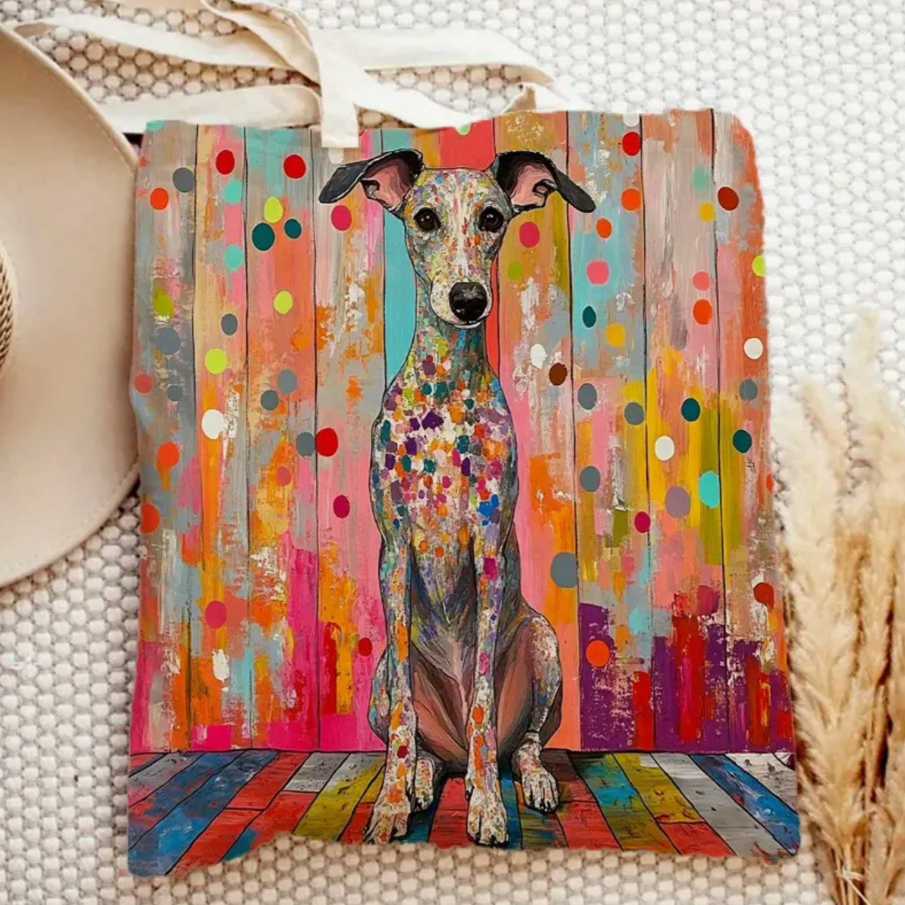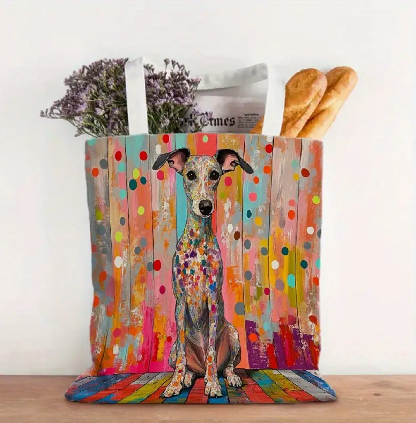 This large handheld shopping tote features a single piece of abstract greyhound dog artwork, measuring 35.56 x 40.64cm. Crafted from high-quality polyester, it is reusable and showcases a vibrant polka dot pattern.