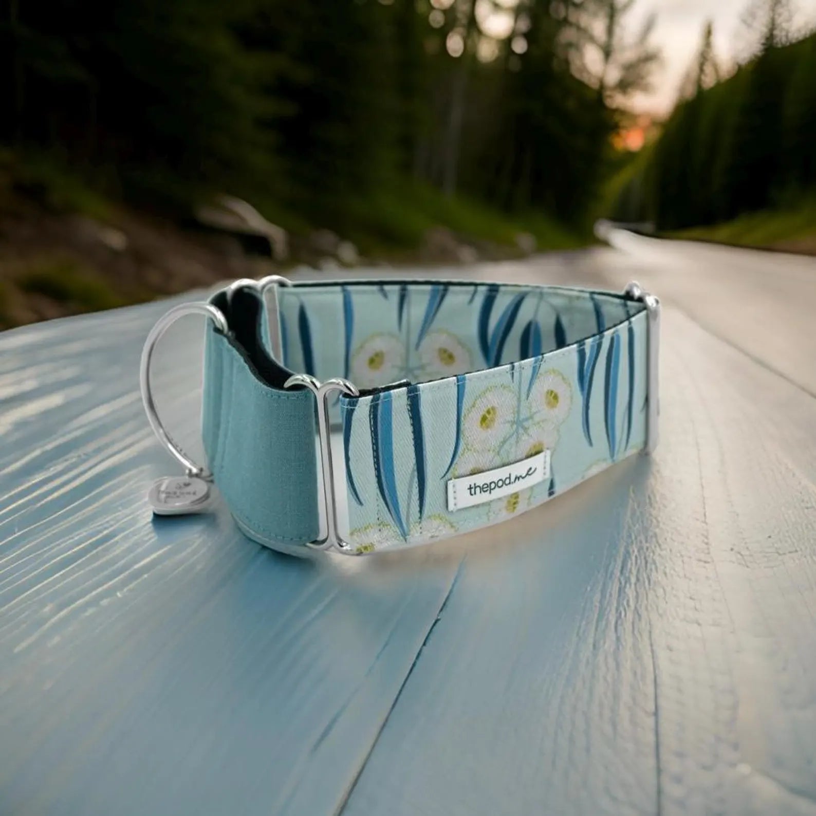 The Aussie Native Eucalyptus Sky Martingale Collar is crafted from organic cotton and durable nylon webbing, offering exceptional strength and comfort. With sturdy silver hardware and a reliable D-ring, it's the perfect stylish and essential accessory for everyday walks.