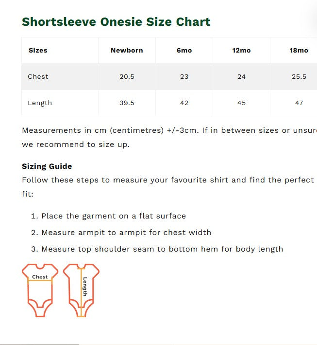 Sizes: Newborn, 6 months, 12 months, 18 months. Check our size chart for measurements.