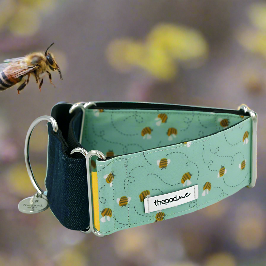 The Bees Martingale Collar is crafted from organic cotton and durable nylon webbing, offering exceptional strength and comfort. With sturdy silver hardware and a reliable D-ring, it's the perfect stylish and essential accessory for everyday walks.
