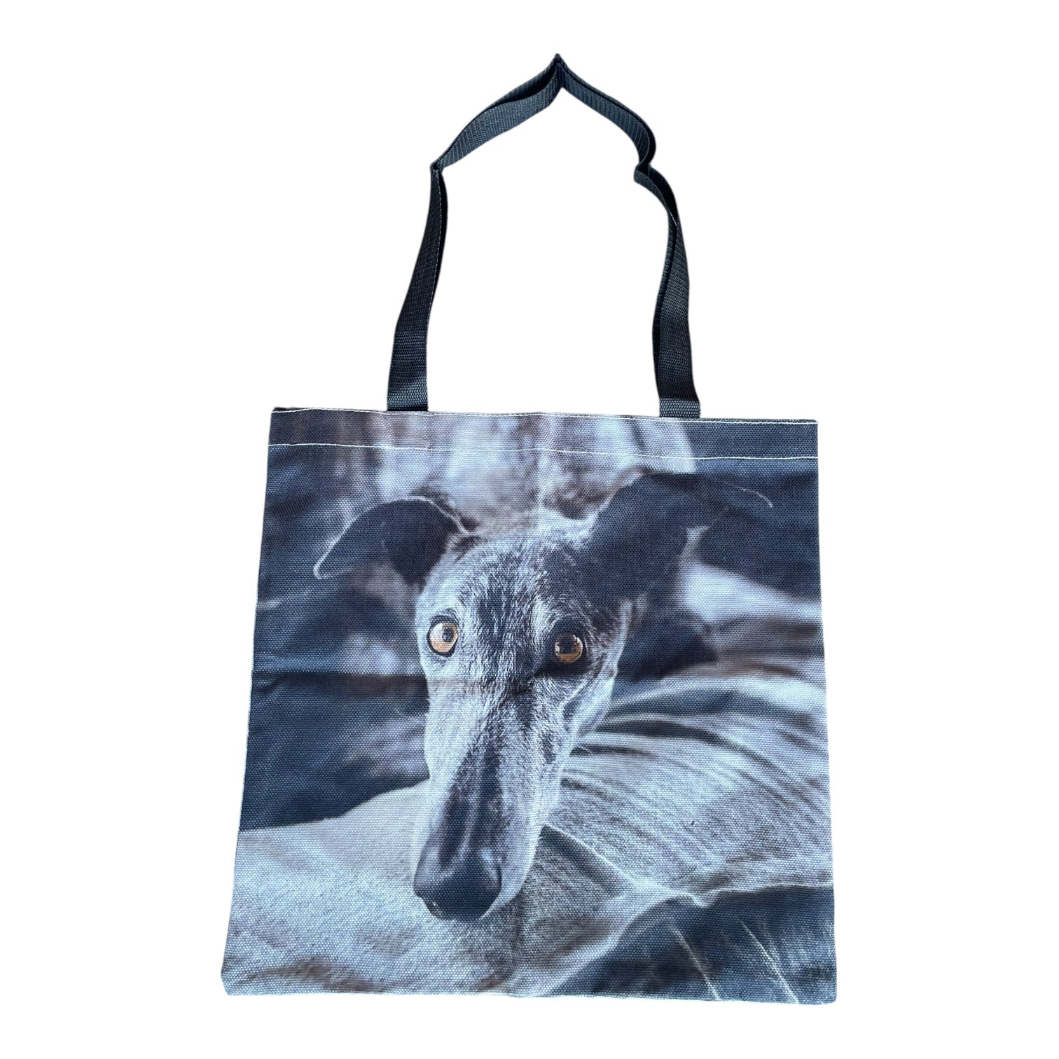 This tote showcases a striking black greyhound gazing directly at you. Constructed from durable canvas, it is perfect for daily use. Suitable for shopping or running errands, this hand-washable bag combines functionality with a sleek, contemporary design.