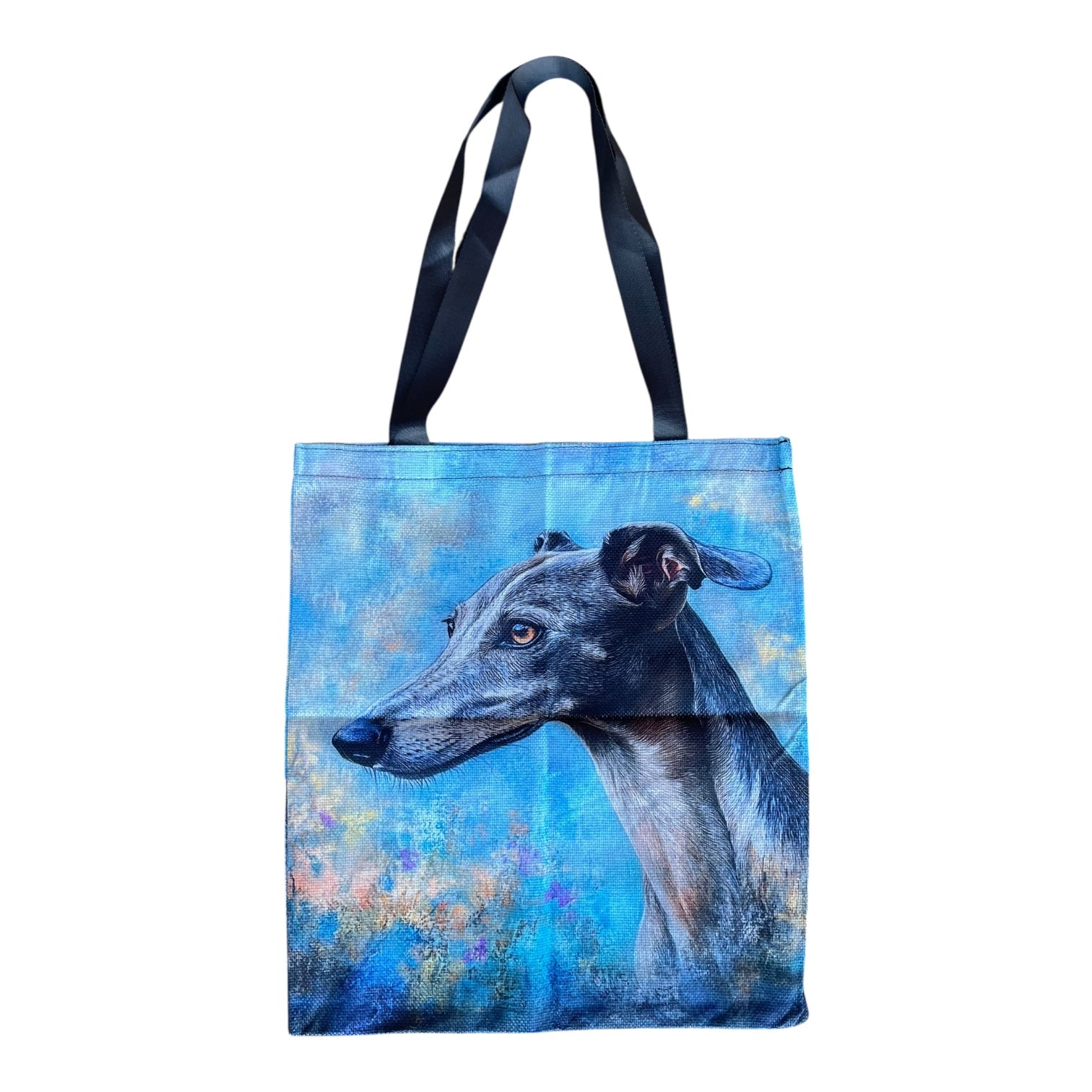 Featuring a beautiful greyhound design on a blue background, this tote is crafted from durable canvas for everyday wear. Ideal for shopping or errands, this hand-washable bag offers both utility and a modern aesthetic.