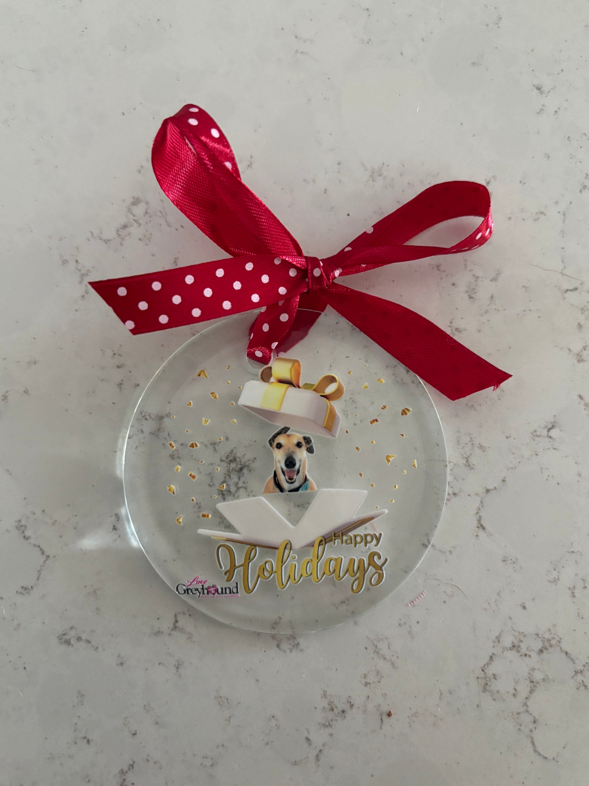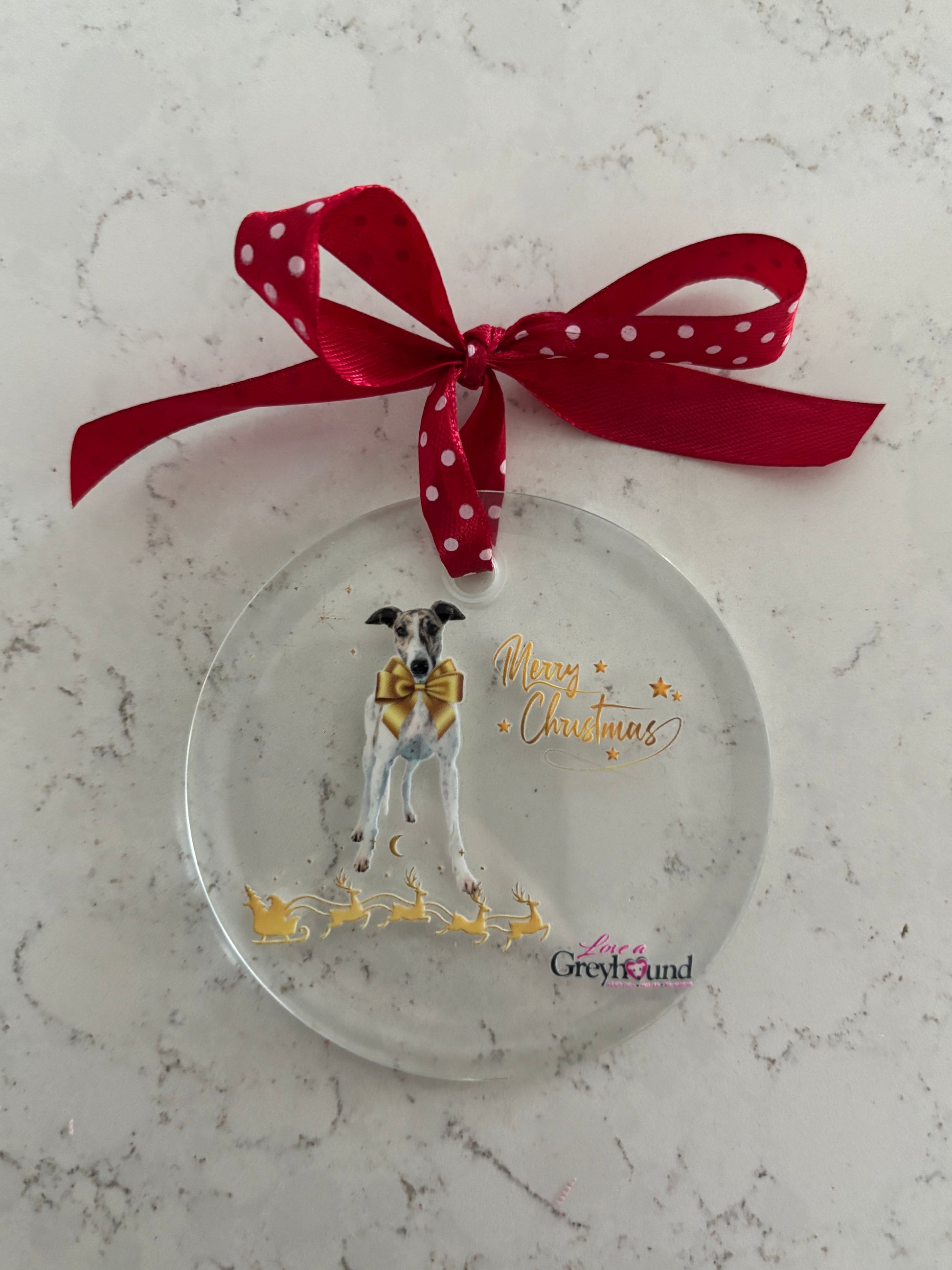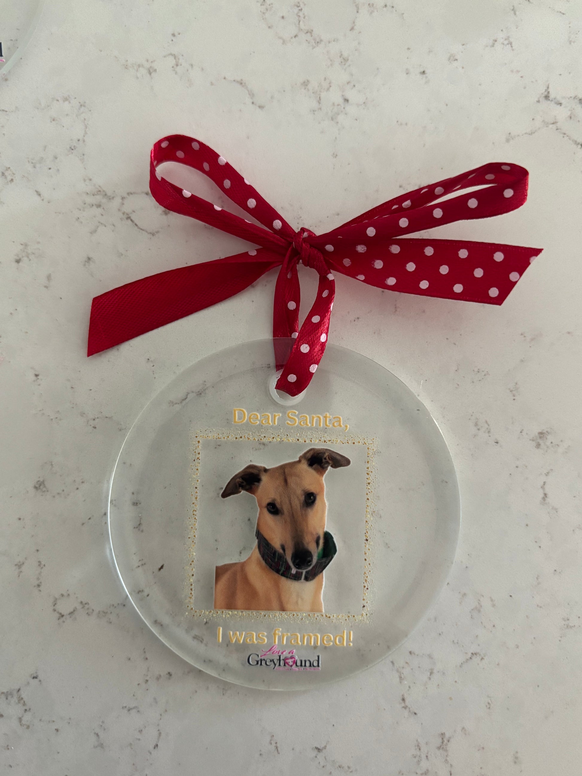 This elegant Glass Bauble Set includes custom UVDTF stickers with a prominent raised 3D effect, showcasing “Happy Holidays” Roscoe, “Merry Christmas” Johnny, and “Dear Santa I Was Framed” Henry. Each 8cm bauble features sophisticated gold tones accented with red ribbon, offering a chic and personalised holiday decoration. The set is beautifully packaged in a Merry Christmas gift bag.