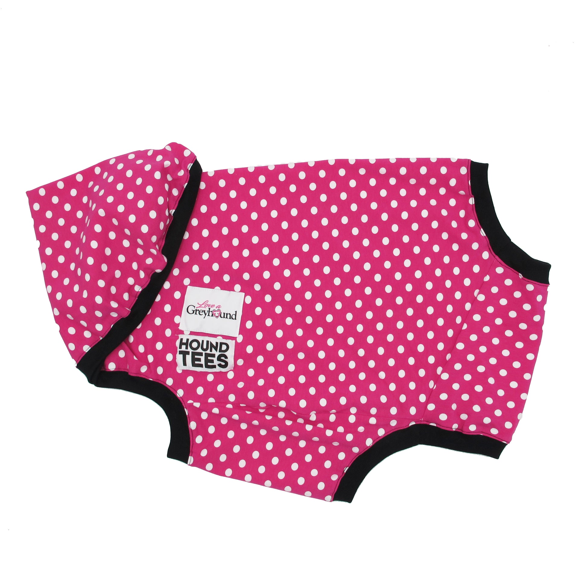 Classic Tee style in a bright pink and white polka dot with black trim.