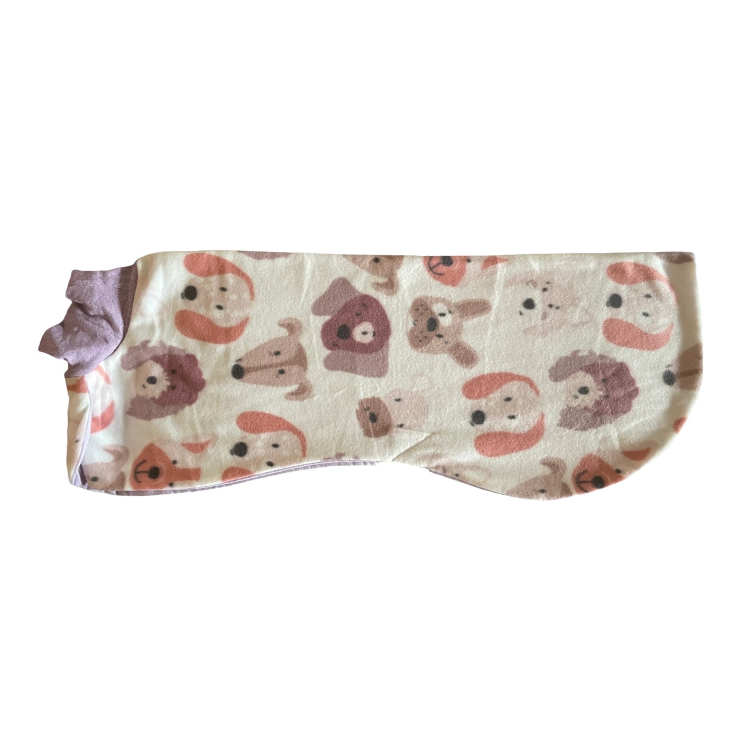 The Dogs Coat features a soft fleece outer and a cosy purple flannelette lining — perfect for cool-weather walks or post-nap struts around the yard.