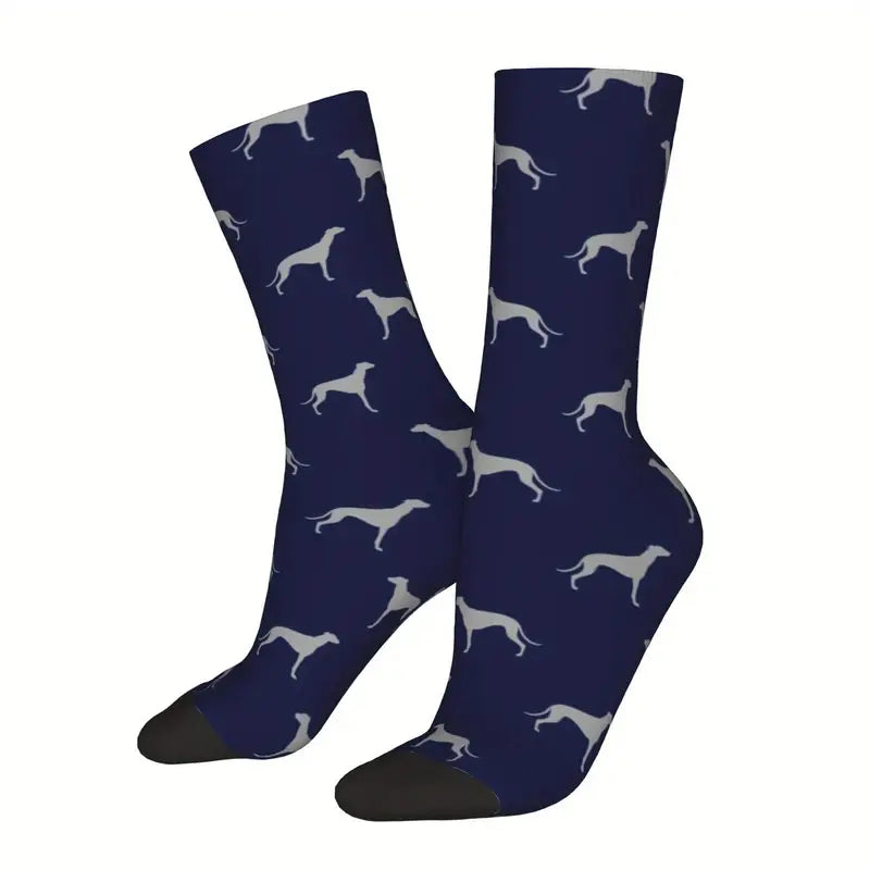 These Greyhound Silhouette Socks feature a full-body greyhound print on a navy blue background, combining style with function. Crafted from breathable polyester, they offer durability and comfort ideal for casual or athletic wear. Designed for easy care with hand wash or dry clean recommendations, these socks provide a playful yet practical addition to your wardrobe.