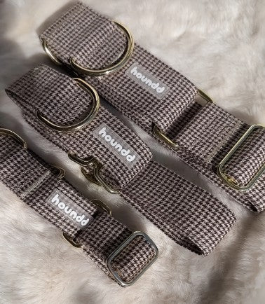 A timeless classic with a Houndd Co. twistâmeet the Hounddstooth Martingale Collar. Crafted from a luxurious cotton-linen blend, this collar offers a structured, durable feel while remaining lightweight and breathable.