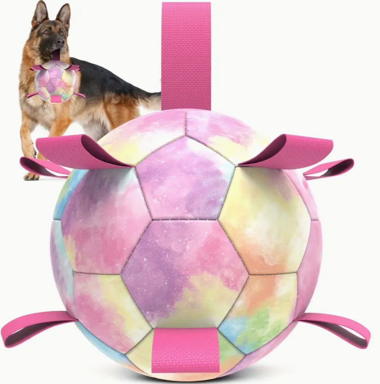 This Inflatable Football Dog Toy in vibrant rainbow pink is crafted from durable rubber and reinforced with nylon straps, ensuring long-lasting play for dogs of all sizes. Designed for interactive outdoor fun, it includes a hand pump for easy inflation, making it ideal for engaging your dog in active exercise and mental stimulation. Suitable for small to large breeds, this toy promotes healthy playtime while withstanding energetic use.