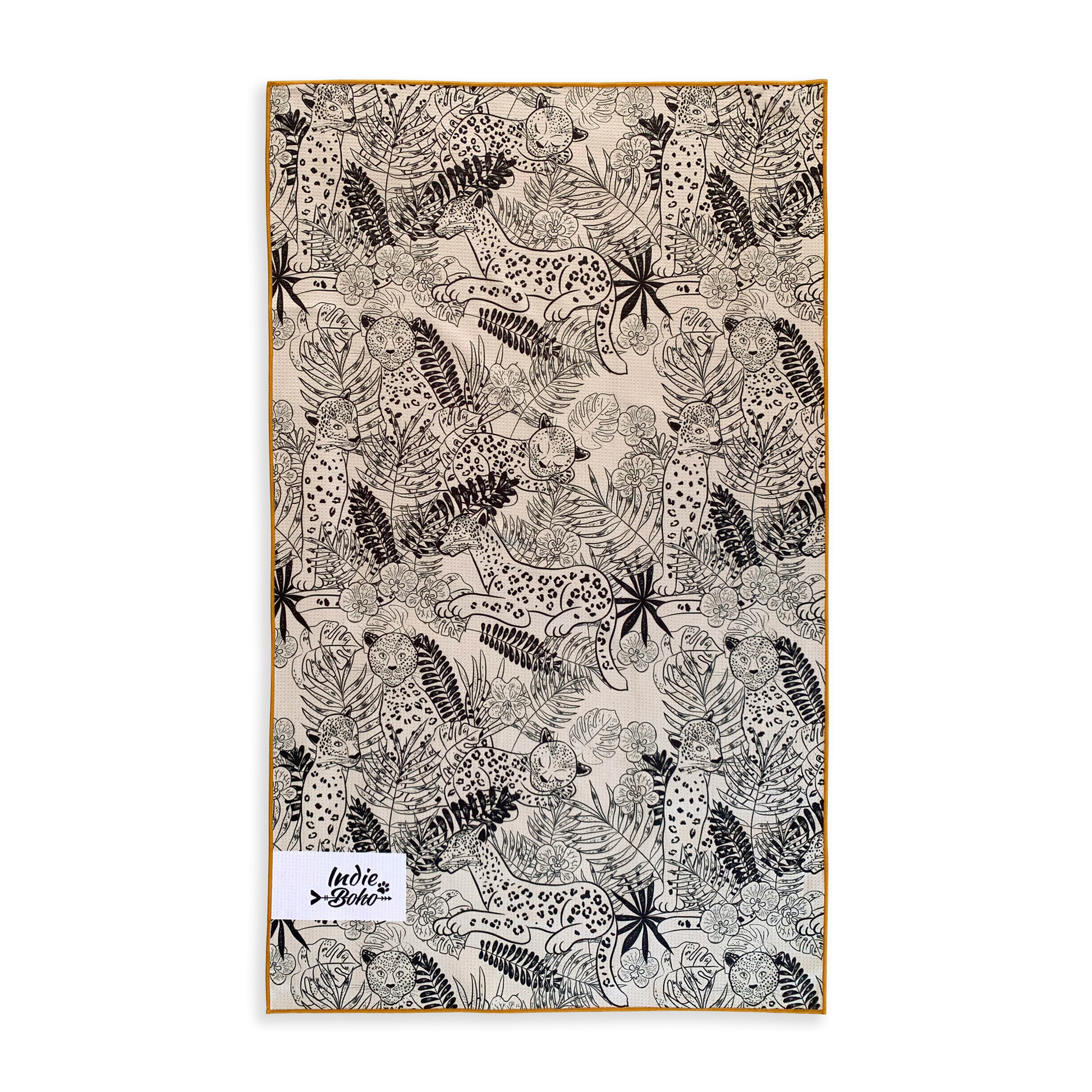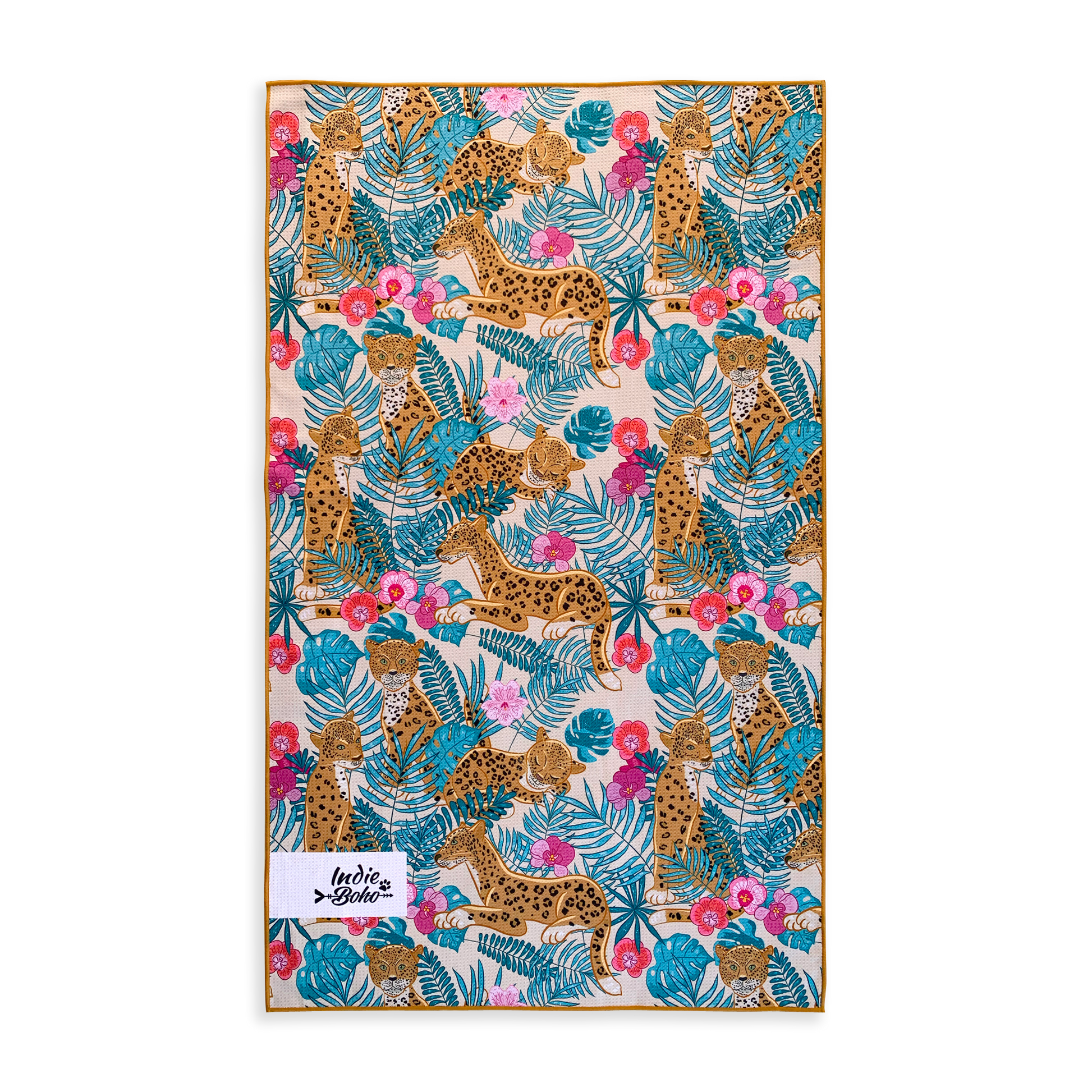 This exotic leopard design was illustrated exclusively by Indie Boho. It features golden leopards resting in the shade of jungle plants and vibrant pink orchids that give this whole pattern an extra dimension!