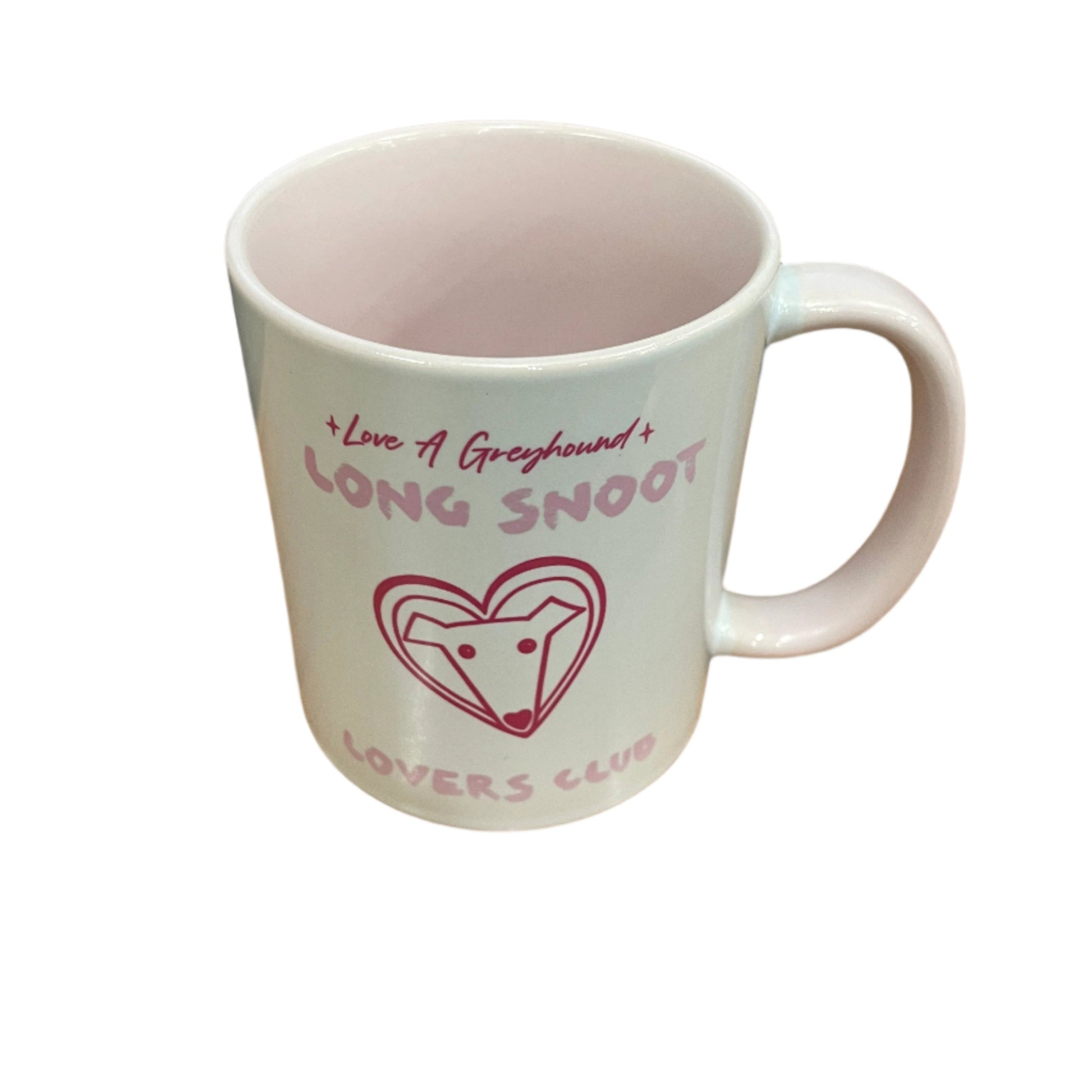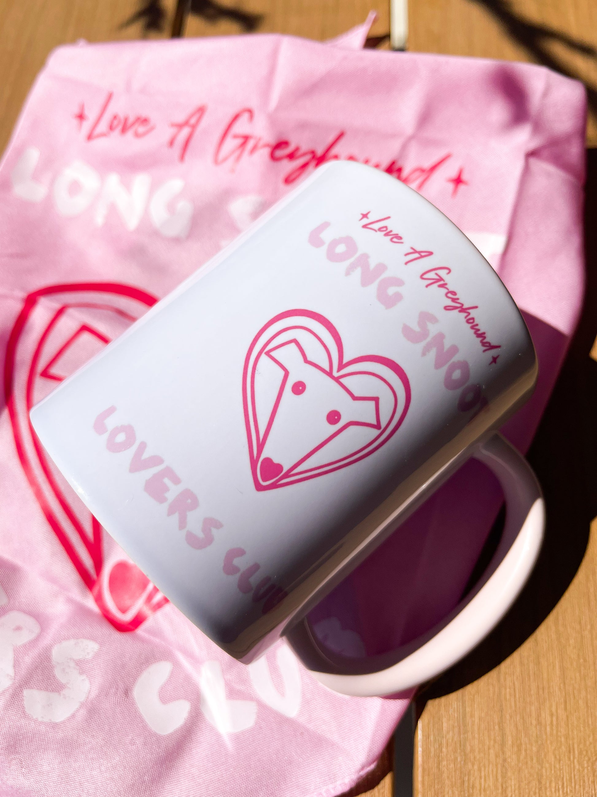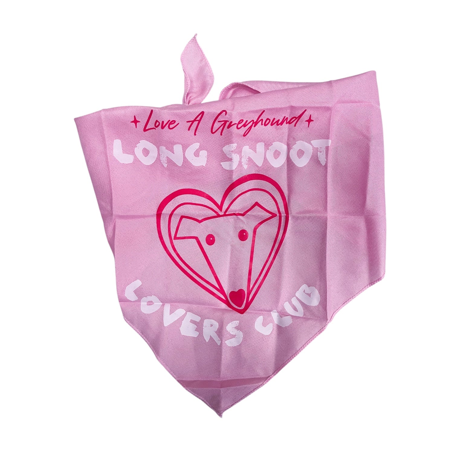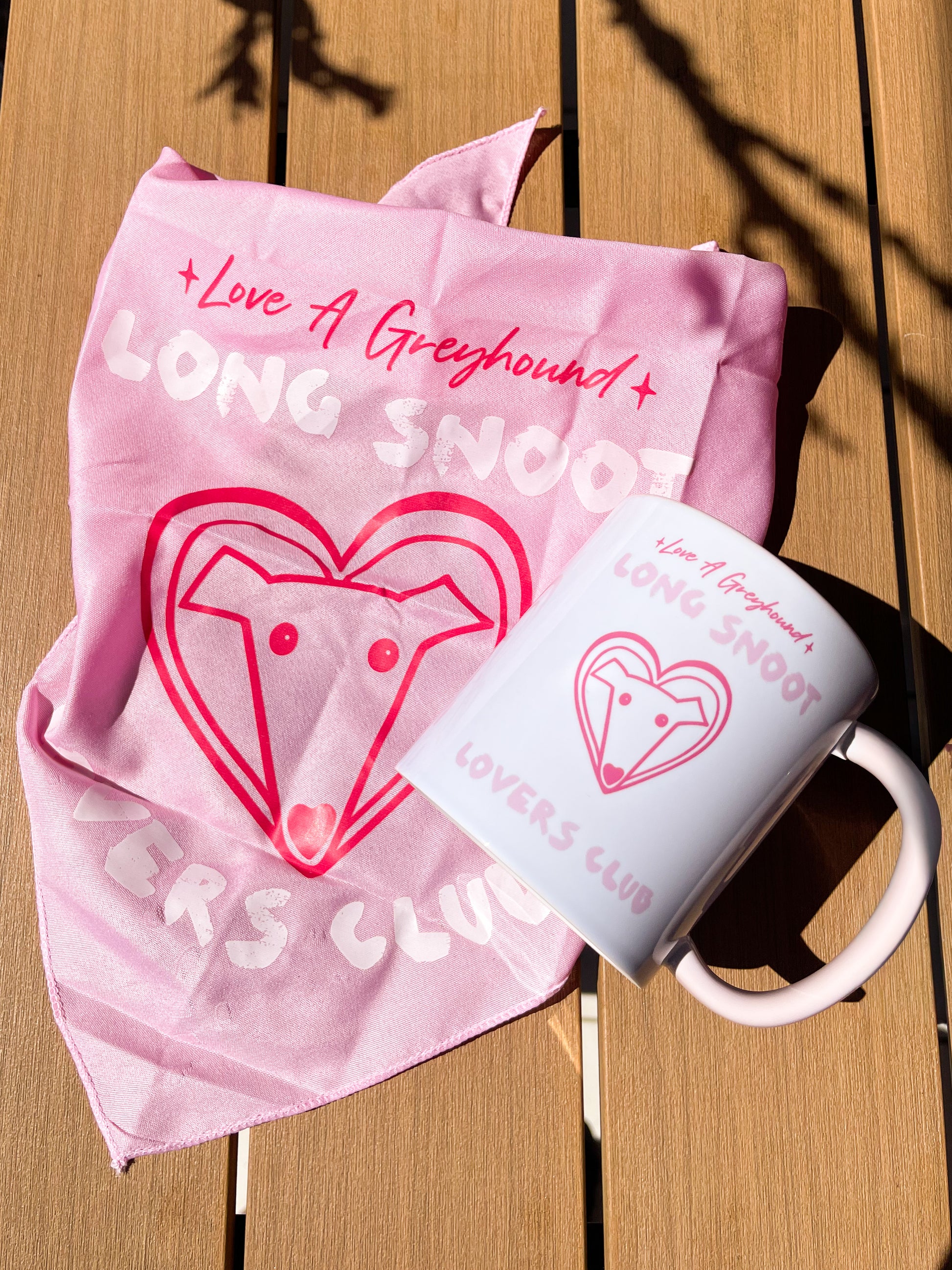 Proudly celebrate your greyhound with the Long Snoot Lovers Club bandana, showcasing a striking pink pattern that stands out. This elegant set also includes a matching mug, making it a perfect duo for enthusiasts.