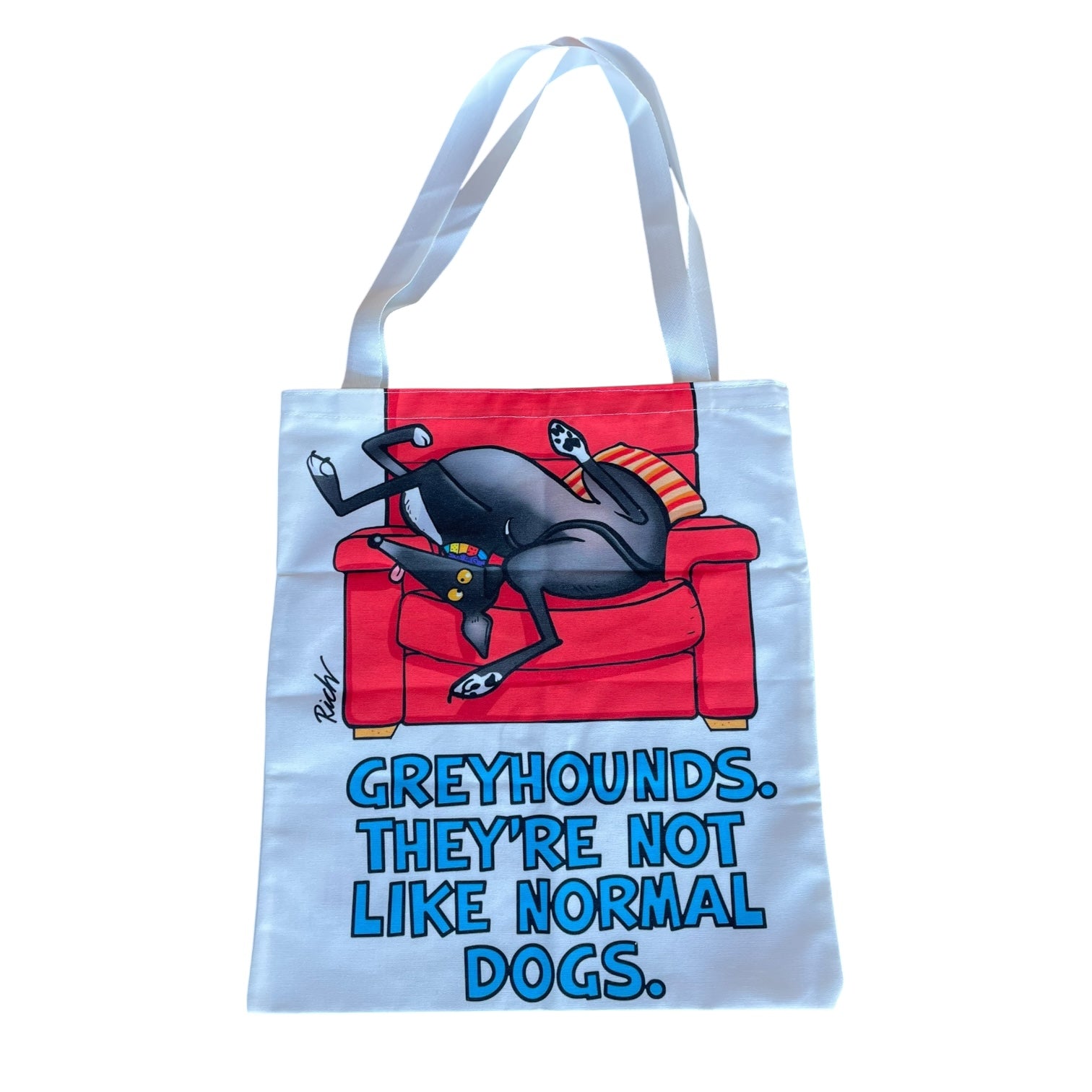 This tote bag features the statement "Greyhounds – they're not like normal dogs." Made from sturdy canvas, it’s designed for daily use. Perfect for shopping or running errands, this hand-washable bag combines practicality with a contemporary style.