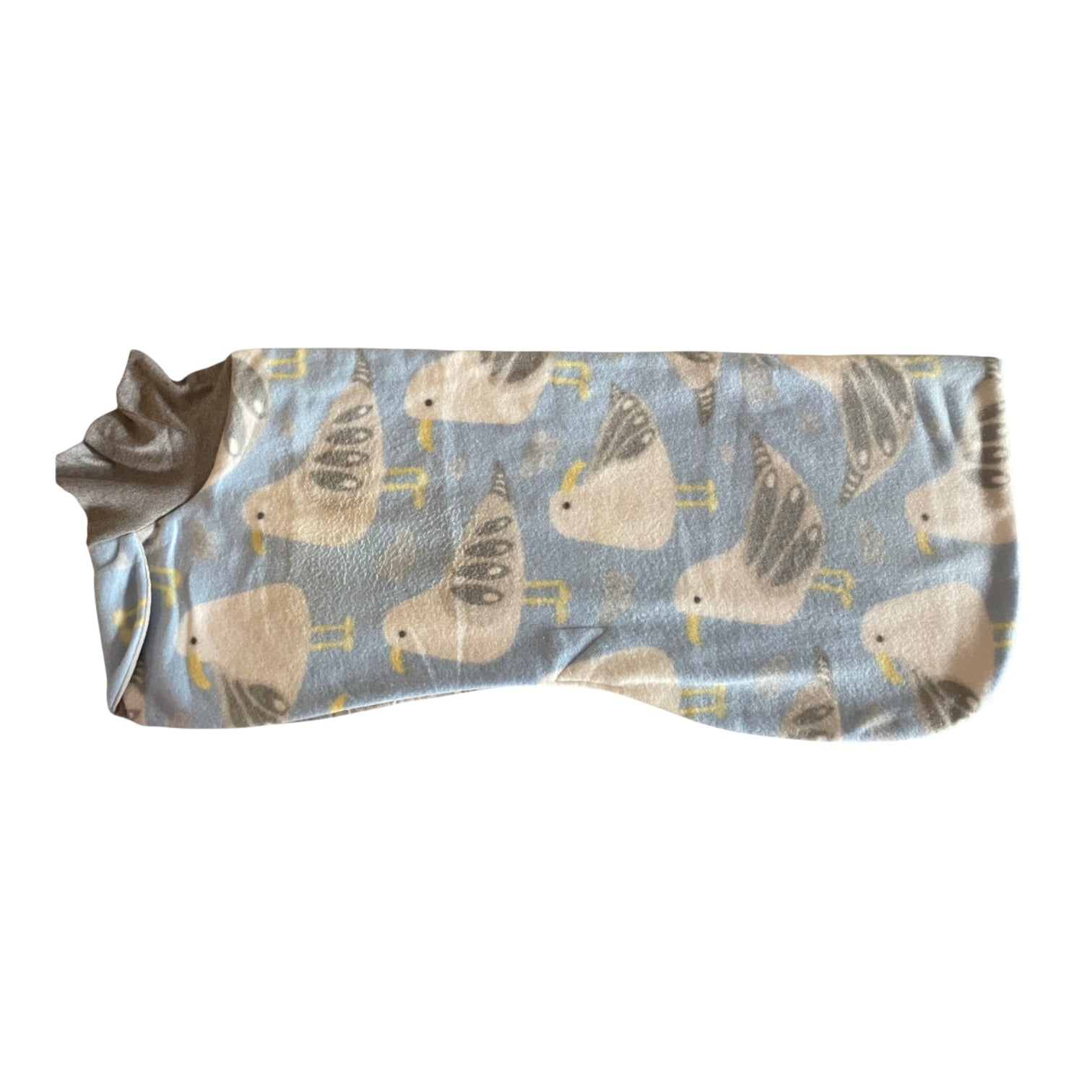 The Seagulls Coat features a soft fleece outer and a cosy grey flannelette lining — perfect for cool-weather walks or post-nap struts around the yard.