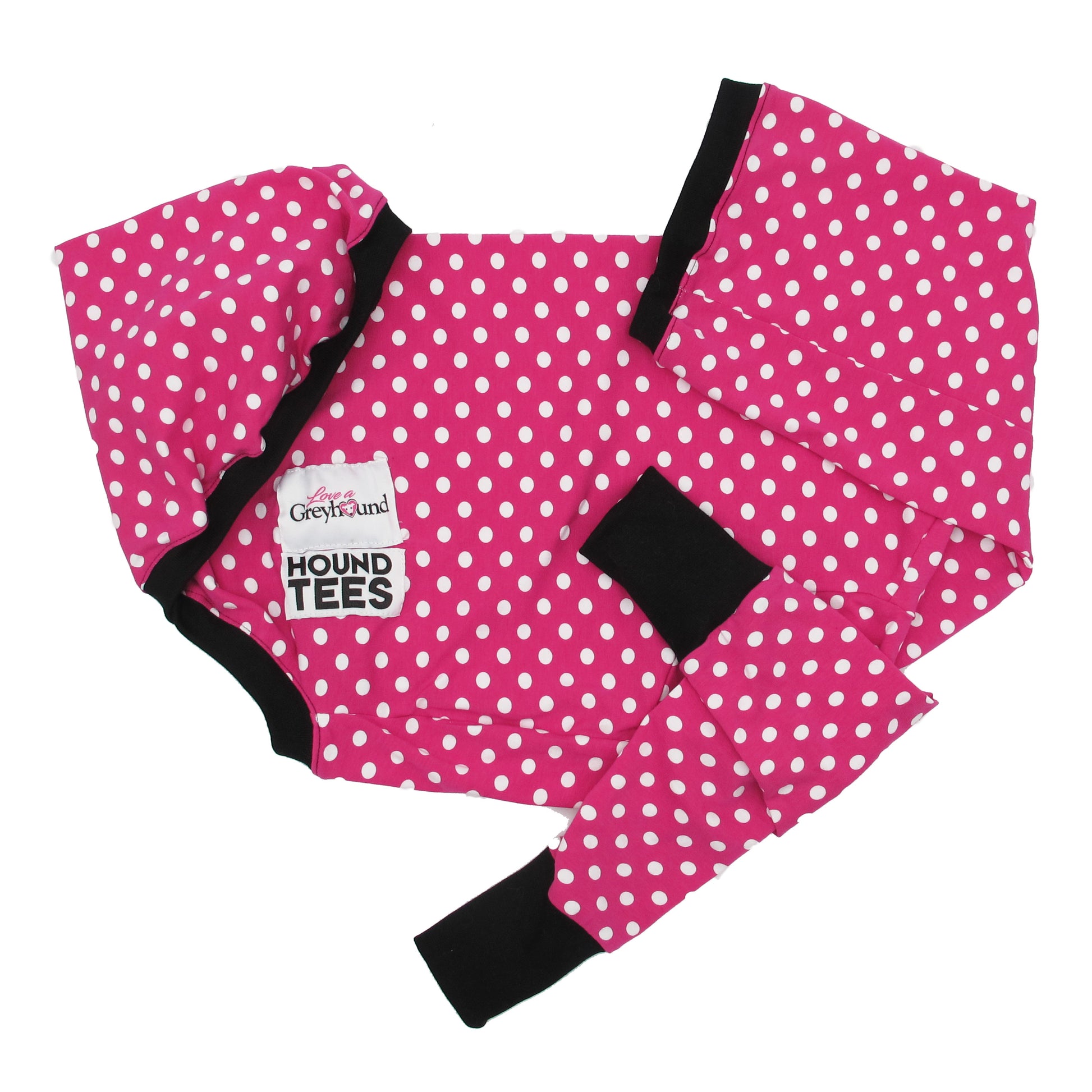 Love A Greyhound x Hound-Tees! Now you can rep LAG in style and comfort while supporting our hounds. Skivvy Long Sleeve style in a bright pink and white polka dot with black trim.