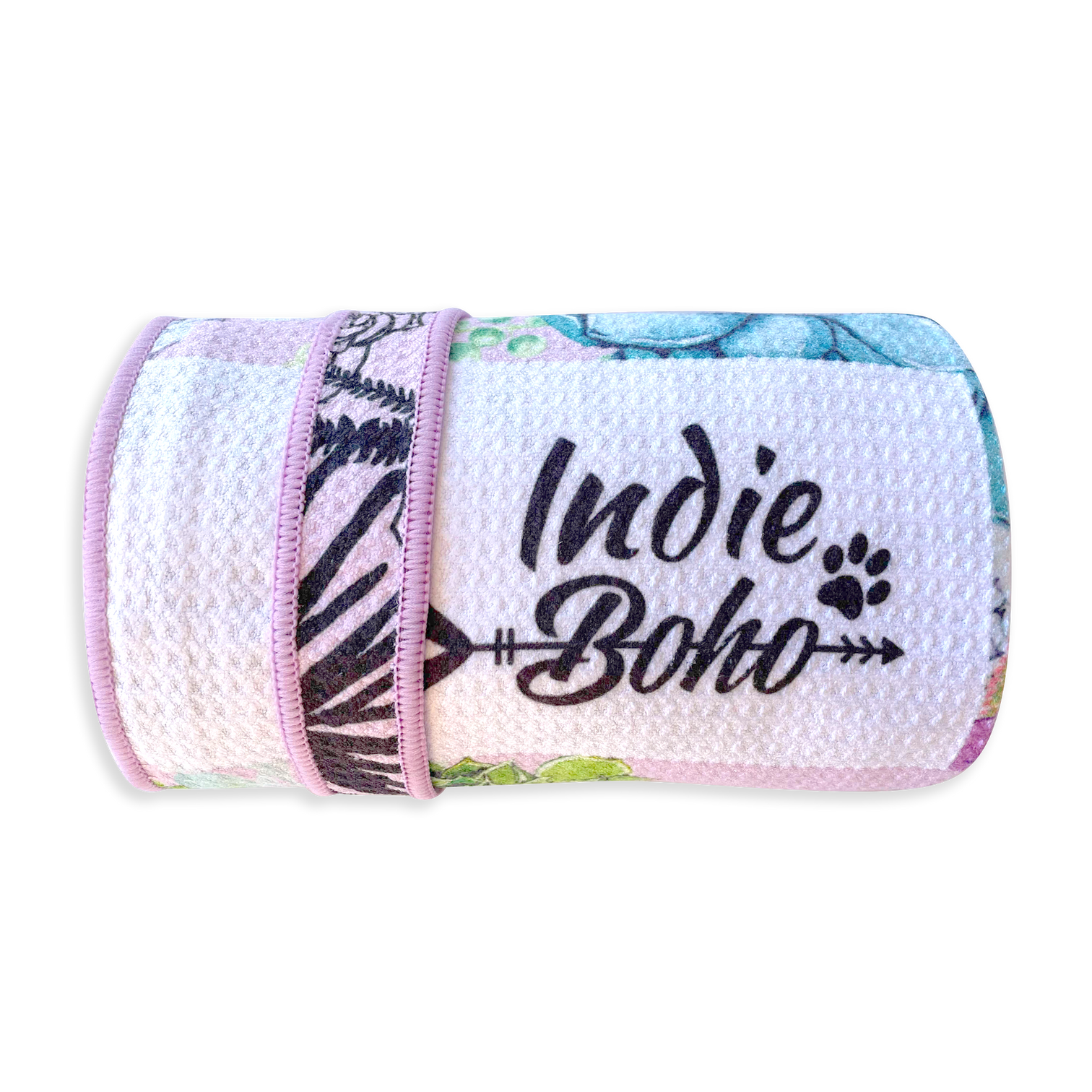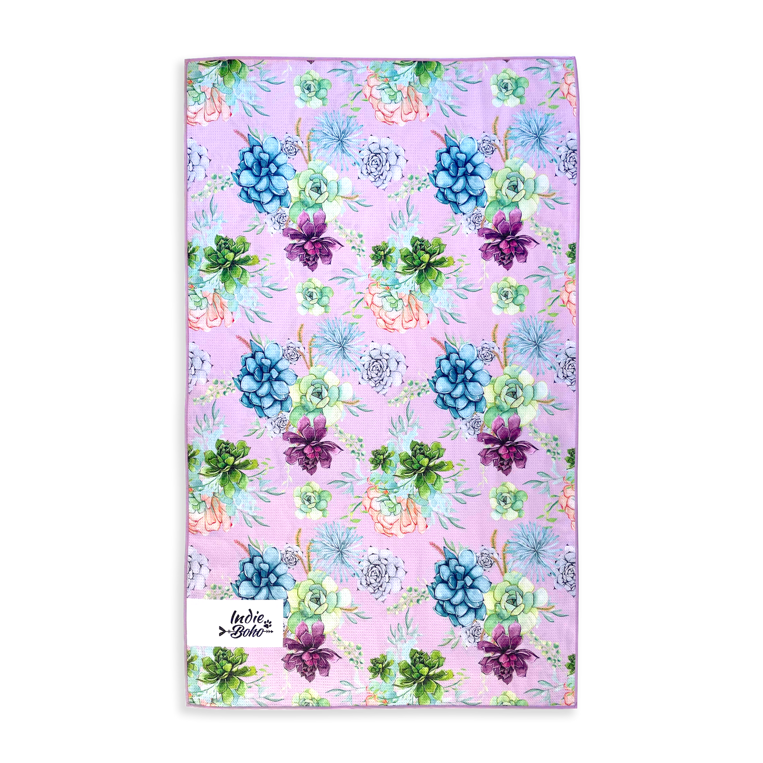 Succulent Medley is an Indie Boho original and long-time favourite design for many. It comes in all of our bedding and travel products and is now available in a matching quick-dry towel. We have chosen a lush lilac colour for this towel, to hide dirt / fur better and to make it more fun, like a beach towel!