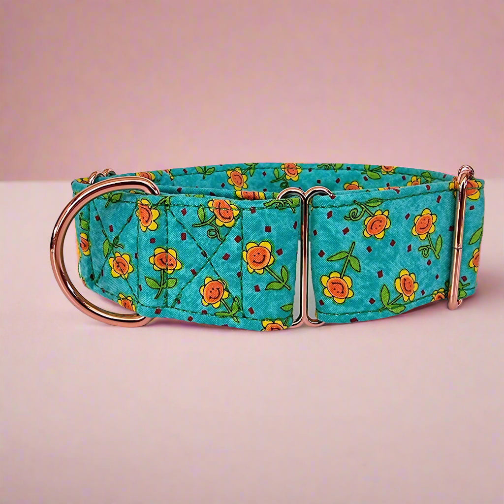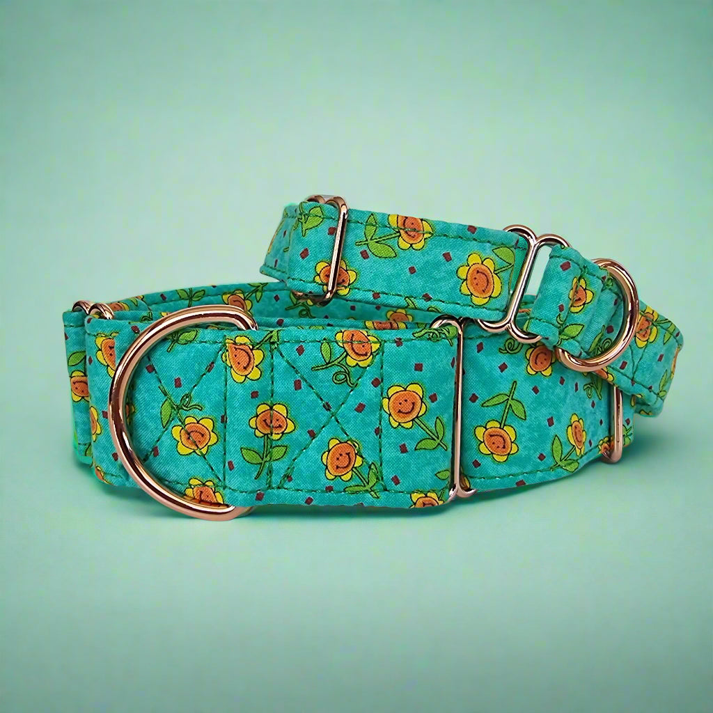 The sunflower Martingale Collar is crafted from durable cotton, offering exceptional strength and comfort. With sturdy rose gold hardware and a reliable D-ring, it's the perfect stylish and essential accessory for everyday walks.