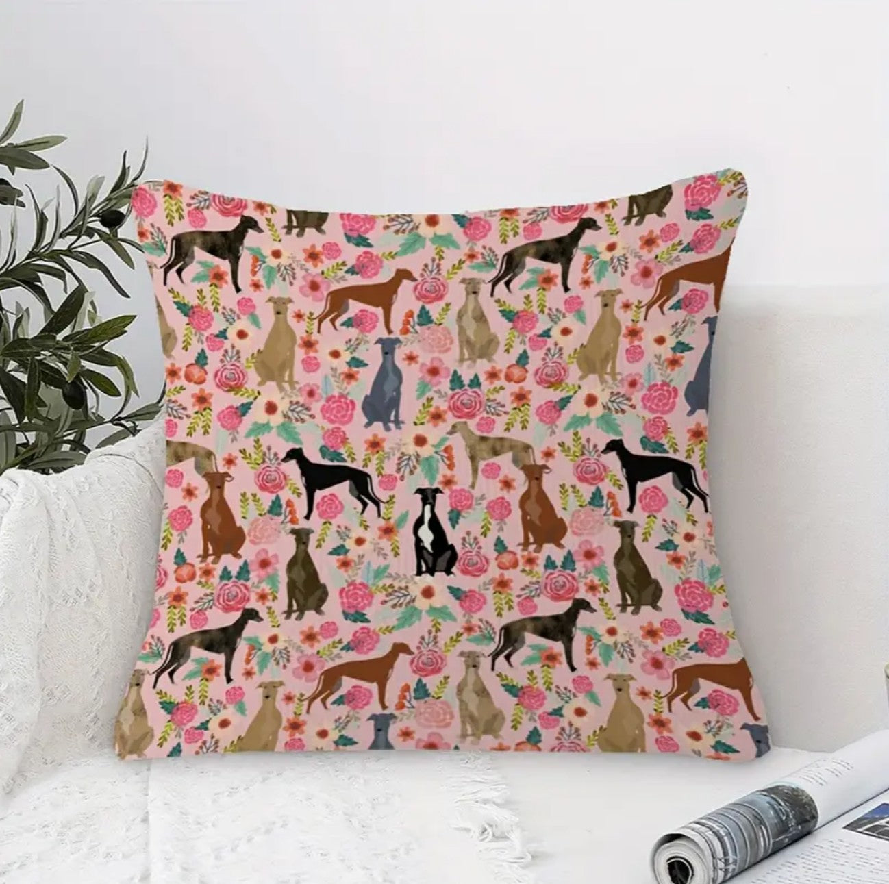 This double-sided pillow cover, measuring 45.72 x 45.72 cm, features a vintage greyhound floral and brindle dog pattern printed on soft polyester plush fabric. Designed with a discreet zipper closure, it offers easy removal and machine washable convenience, making it ideal for maintaining a fresh and stylish look. Perfect for sofas or bedrooms, this cover adds a cosy yet sophisticated touch to living spaces without the filler, allowing you to customize your comfort. Its playful yet elegant design suits home stylists seeking a distinctive accessory that combines durability with refined aesthetics.